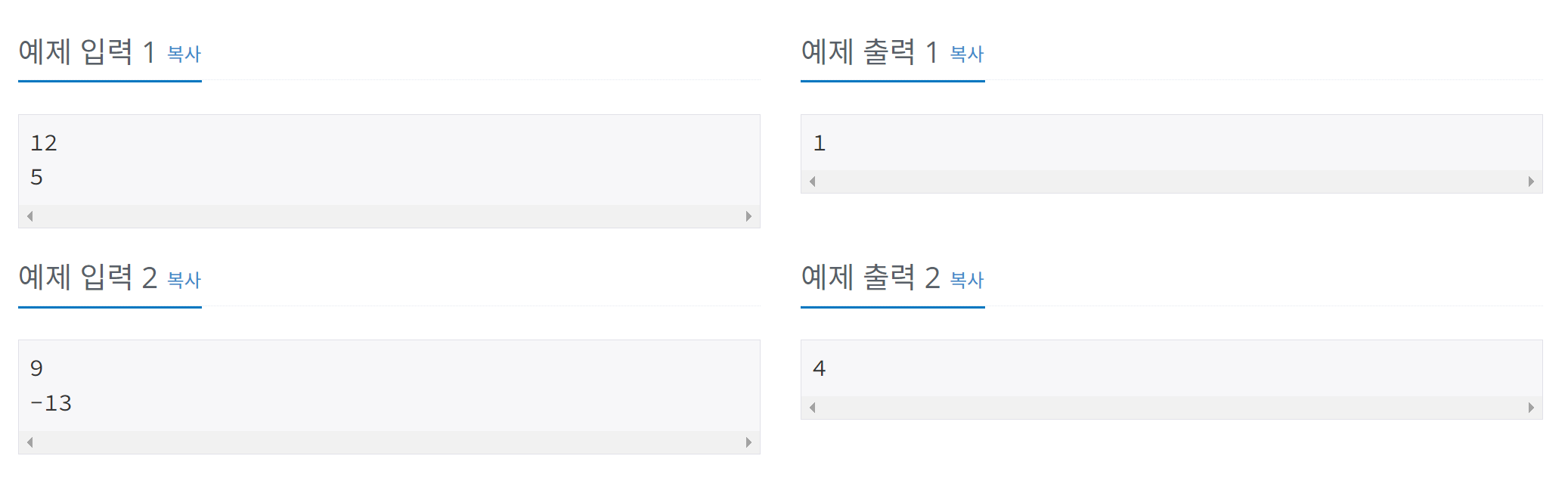 첫 줄에는 정수 x가 주어진다. (−1000 ≤ x ≤ 1000; x ≠ 0) 다음 줄에는 정수 y가 주어진다. (−1000 ≤ y ≤ 1000; y ≠ 0)