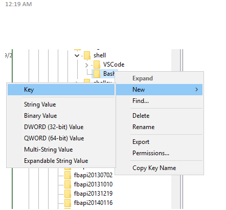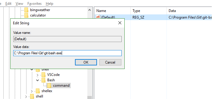 4. 다시 왼쪽 디렉토리에서 Bash에서 새 키를 만들고 이름을 "command"로 지정. 이 키의 값을 git-bash.exe 경로로 설정.