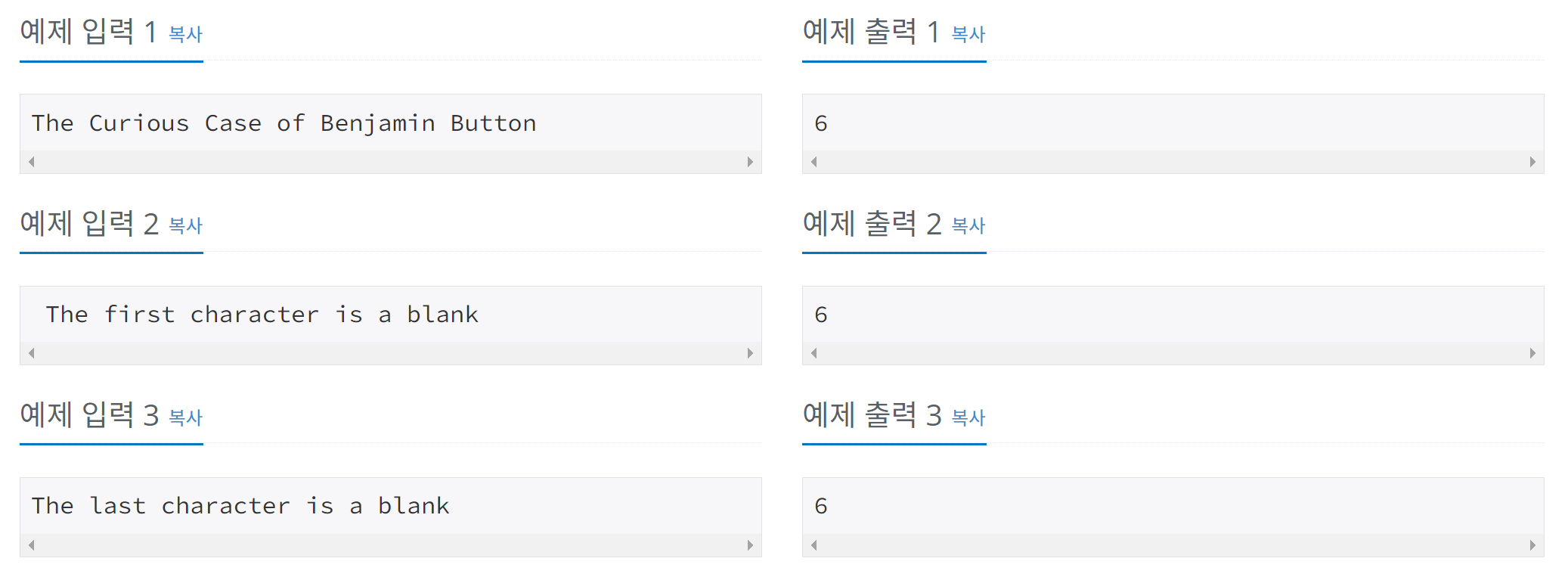 첫 줄에 영어 대소문자와 공백으로 이루어진 문자열이 주어진다. 이 문자열의 길이는 1,000,000을 넘지 않는다. 단어는 공백 한 개로 구분되며, 공백이 연속해서 나오는 경우는 없다. 또한 문자열은 공백으로 시작하거나 끝날 수 있다.